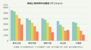 下の表は、首都圏を例に新築と中古マンションの平均価格を比べました。首都圏では、買いやすい築11年より古い中古マンションにお手ごろ感があり、非常に活況です。