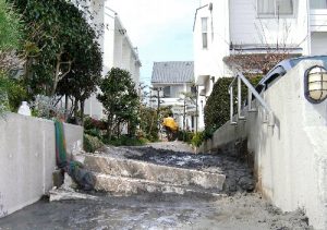 2008年の7月に発生した兵庫県神戸市の都賀川の水害では、川べりに遊歩道のあるありふれた市街地の小川です。ところが上流に大雨が降ったため、水位が10分間で1.3mも急上昇し、川で遊んでいた子どもたちなど5人が流されて亡くなってしまったのです。