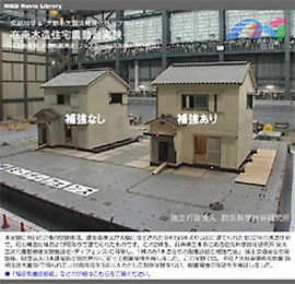この2棟を、兵庫県三木市にある防災科学技術研究所 実大三次元震動破壊実験施設(E-ディフェンス)に移築し、1棟のみ『木造住宅の耐震診断と補強方法』耐震補強を施しました。