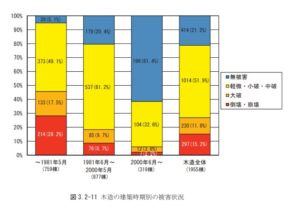 1981年から2000年までの新耐震基準の木造建物877棟のうち、76棟(8.7%)の倒壊が確認されました。