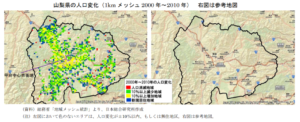 甲府市内の人口分布の変化は、甲府南部の国道 20 号線(甲府バイパス)に沿って帯状に人口増加し、その帯の内側と外側の地域で人口減少が見られ、人口減少地域の内外に新規居住地域が多数点在するという分布です。