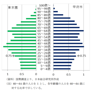 甲府市は、大学などの施設があり若年層の割合が多く、理想的な人口構成になっています。