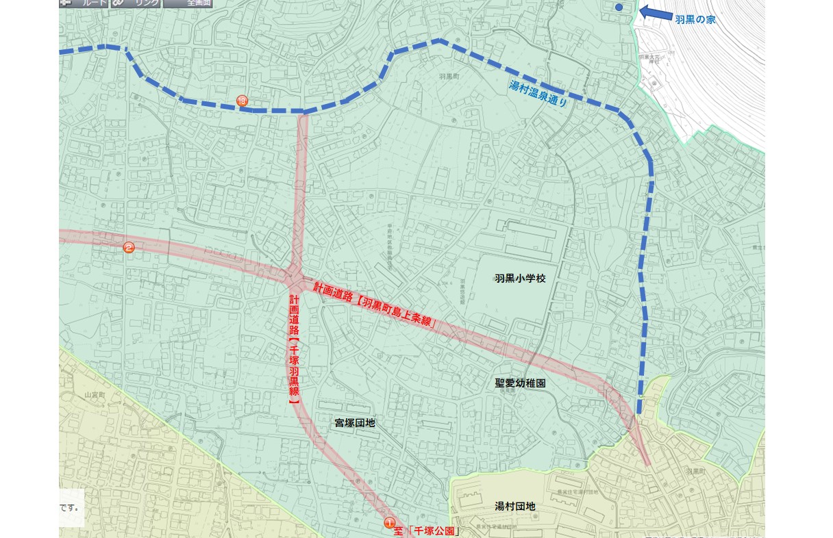 この「計画道路」は2本あり、ひとつが「千塚羽黒線」と呼ばれ、この計画道路は道幅が12m~16mとなり「山の手通り」から千塚公園の脇を通って「湯村温泉通り」へつながります。