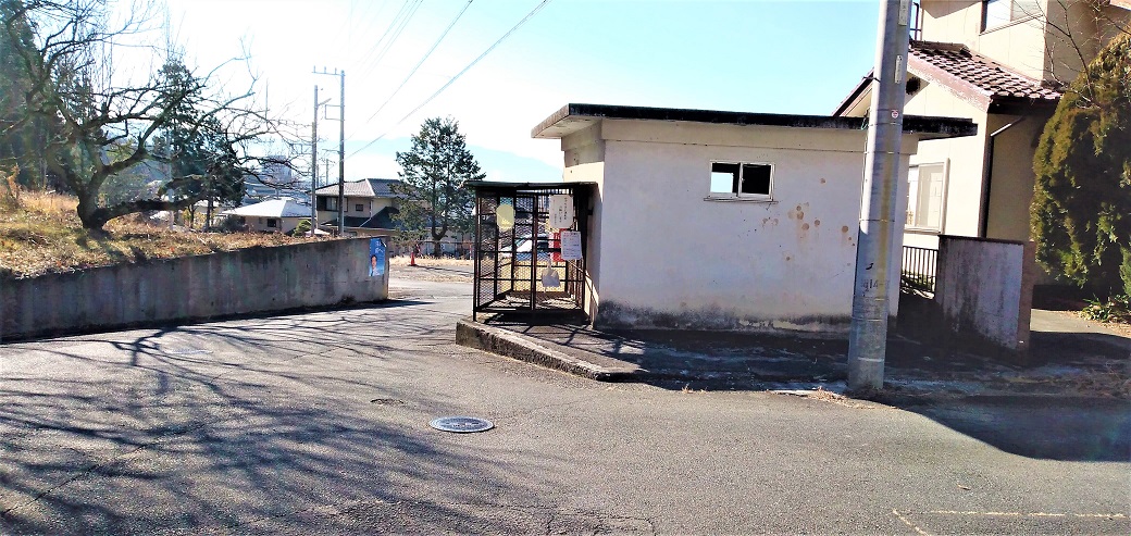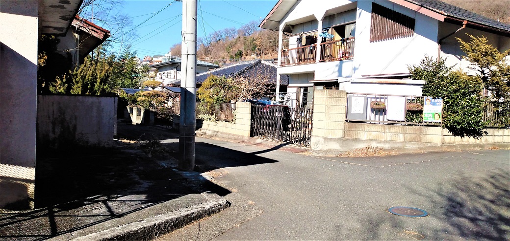 その家は、湯村温泉通りから「羽黒町自治会館」縦型の看板があるT字路を、北に200mほど登った静かな場所にあります。T字路から入ったすぐのあたりは道幅が少し狭く感じるかもしれませんが、そこを過ぎれば車のすれ違いも全く気にしない道幅となります。