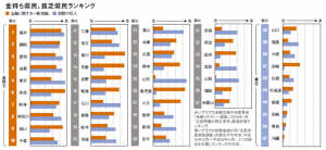 『金融リテラシー調査』の正答率ランキングに、県別の収入ランキングを加味して、金持ち県民・貧乏県民のランキングを算出しました。