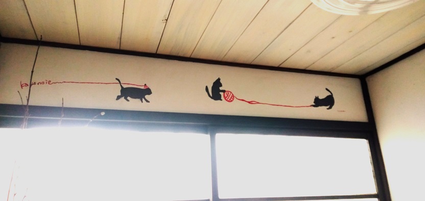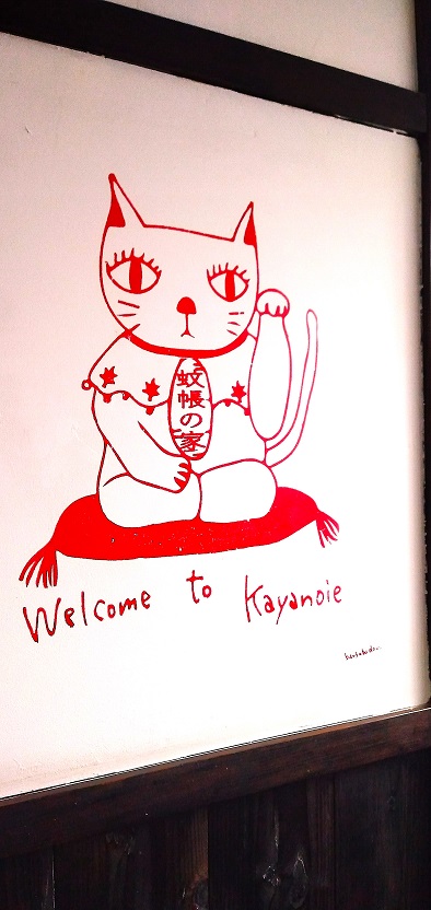 「蚊帳の家」にはバオバブ堂さんの描いたアートがあります。 「蚊帳の家」に来られた方は、トイレで見かけたと思いますが、白い漆喰の壁にアートが掛かれています。 弊社が依頼をして、2年に1回くらいの割合で、「蚊帳の家」にあった古い蒔絵をヒントにバオバブ堂さんに描いて頂いています。