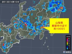 山梨県都留市付近で、レーダーの解析で13日14時10分までの1時間に約100ミリの猛烈な雨が降ったとみられ、記録的短時間大雨情報が発表されました。