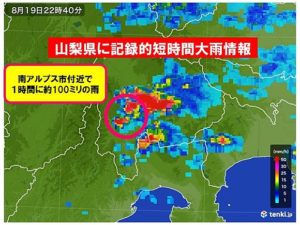 山梨県南アルプス市付近で、午後10時40分までの1時間に約100ミリの雨が降ったとみられ、記録的短時間大雨情報が発表されました。
