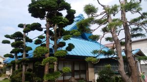 私の会社があるこの家は、築100年くらいの建物で、屋根はわら葺の上に青いトタンを被せた印象的な形をしています。夏はとても涼しく快適ですが、冬は身体の芯から寒く、日中は外よりも寒く感じます。構造としては、コンクリート基礎と呼ばれるようなものはなく、玉石の上に柱や束が直接載っています。そして太い柱と、梁や鴨居と呼ばれる横に渡した材料で支えています。耐震性は低いのですが、屋根が藁葺で軽いことが幸いして、地震では壊れずに現存しています。昔このあたりでは、みんなこのような青い屋根の古い家でしたが、今はこの家だけになってしまいました。