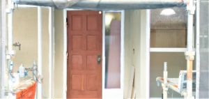 この家の玄関ドアですが、昔の家の特徴である長い庇と玄関が奥に入った間取りでしたので、木製でありながら色あせやひび割れなどの影響も少なく、非常に趣があるものでしたのでペイントをして再生させます。