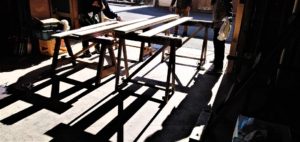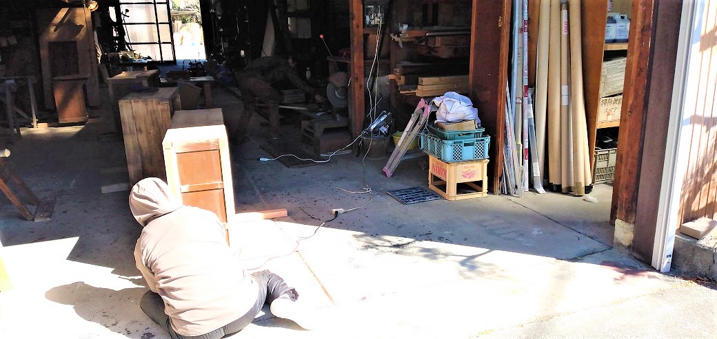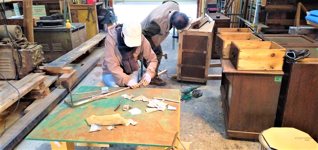 SHOEIの大原社長が選んでくれたユーズドの家具を、アイアン部分は「錆び取り」の作業、木部は「ヤスリ掛け」の作業です。
